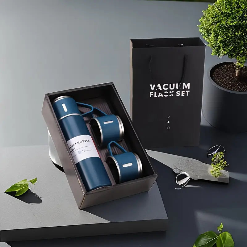 Vacuum Flask Set with 3 Steel Cups and Bottle.